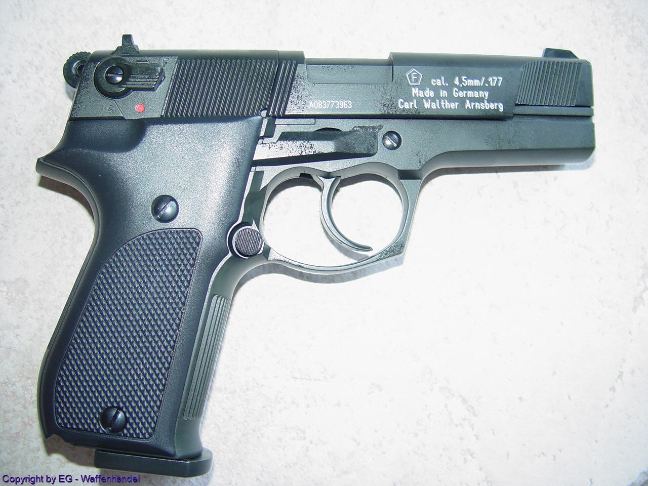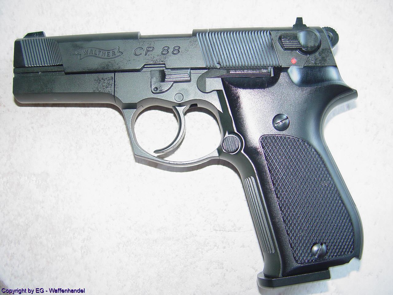 Walther Modell CP88, cal. 4,5 mm, brüniert, 8 Schuß Magazin (Revolver-Trommelmagazin), Antrieb: 12 g Co2 Kapsel (ca. 100 Schuß möglich), Abzug: Single Action & Double Action, Länge: 182 mm, Höhe: 135 mm, Breite: 32 mm, Mündungsgeschwindigkeit (max.) Vo: CP88 ca. 120 m/s = Herstellerangaben, Visierung: Balkenkorn, seitlich verstellbare Kimme, Visierlinie: CP88 = 140 mm, Sicherung: Schwenkhebel beidseitig für Abzug-/Schlagbolzensicherung und Abzugssperre bei geöffnetem Verschluss. Lieferumfang: Waffe, 2 Magazine, Bedienungsanleitung, Inbusschlüsse. |