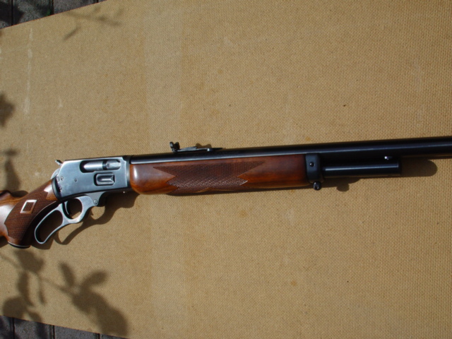 Marlin Mod. 1895 SS im Kaliber 45/70. 4 Schuß - Magazin, Nußbaumschaft mit Fischhaut, Gummischaftkappe, Lauflänge: 55 cm, Gesamtlänge: 102 cm, Gewicht: 3,2 kg |