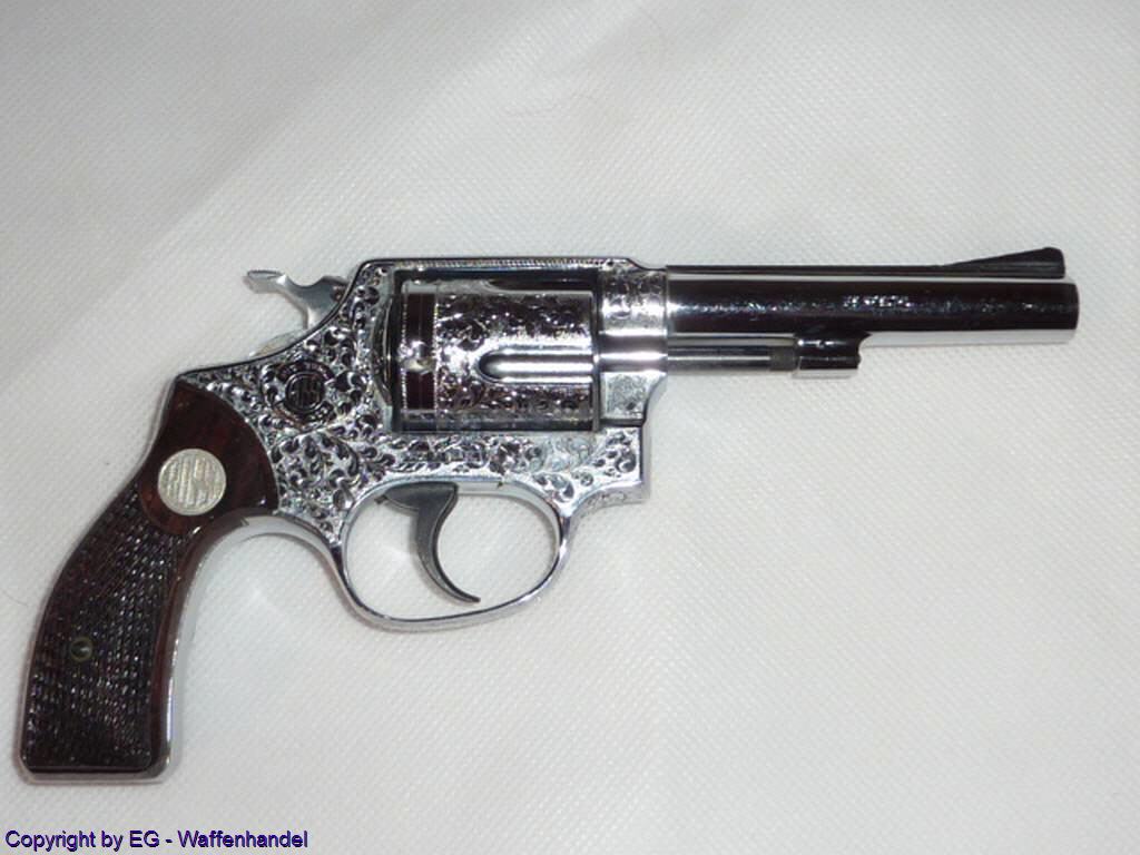 Sammlerstück: Amadeo Rossi im Kaliber .38 Special mit 4" Lauf. Schöne Arabesken zieren das Nickelfinish. |