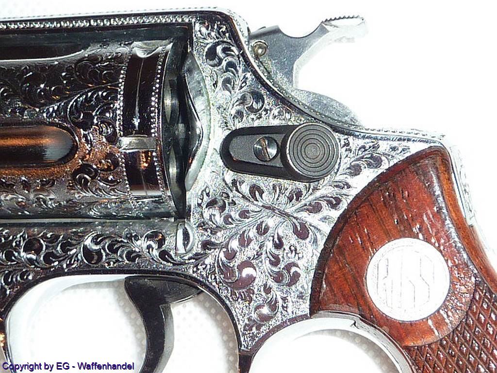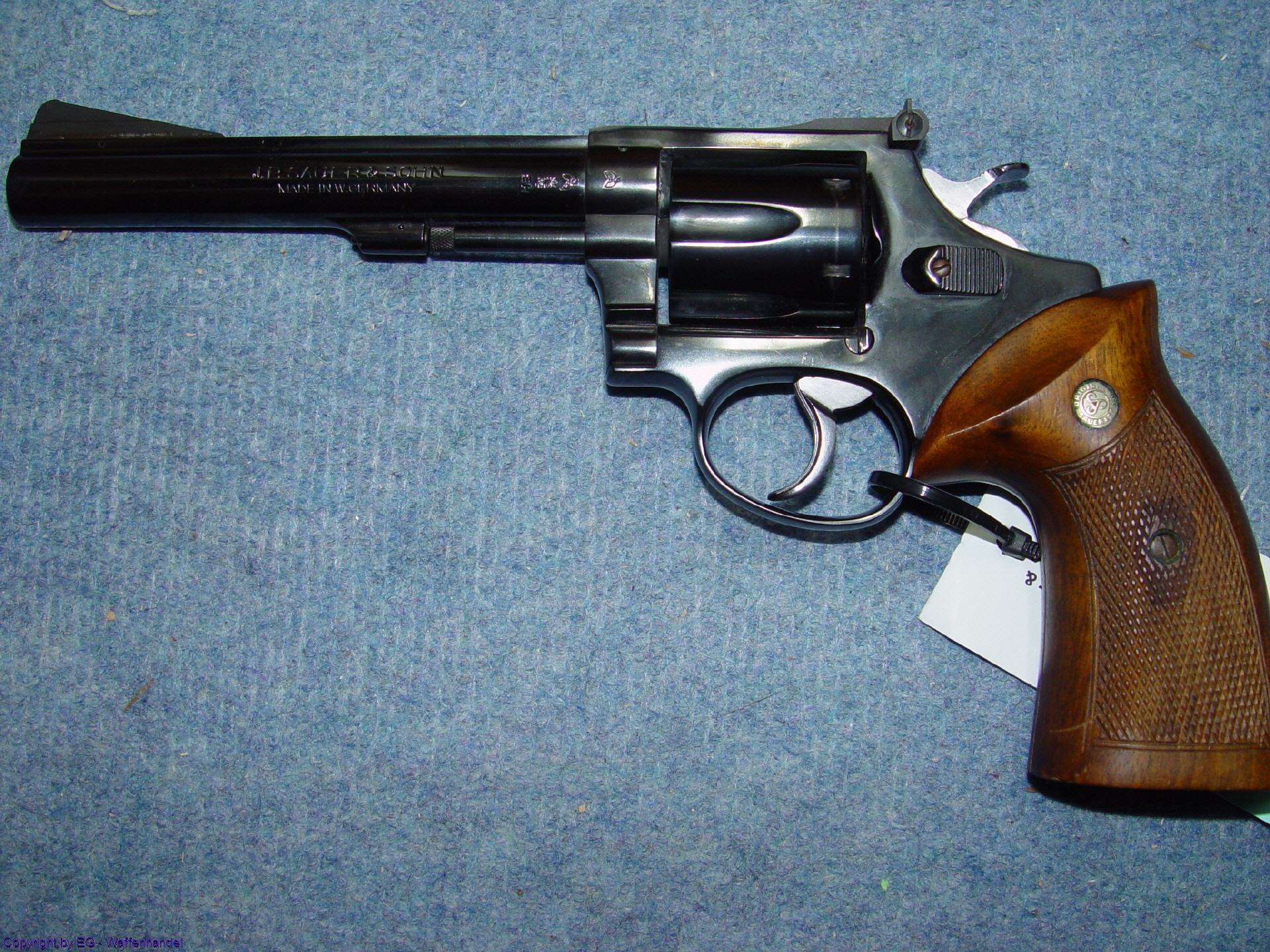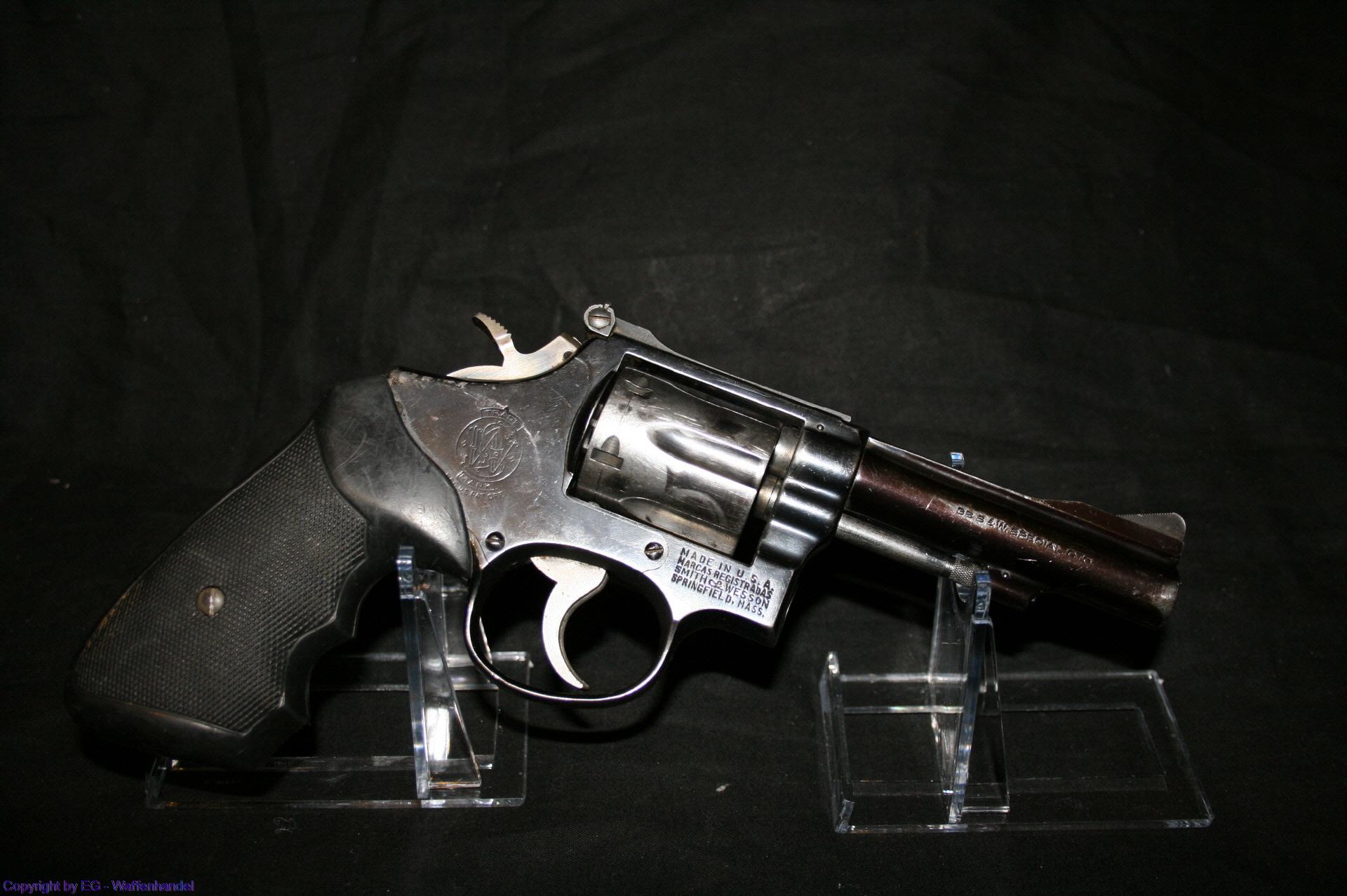 Hersteller: Smith & Wesson Modell: 15-3 Kaliber: .38 S&W Spezial Lauf: 4 Zoll Gesamtlänge: 24 cm Visierung: verstellbare Kimme / Balkenkorn Abzug: trocken und fein stehender Abzug Griff: ERGO-Gummigriffschalen |